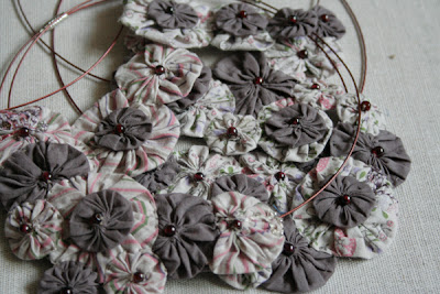 Przygotowania do jarmarku w moim wypadku przebiegały dość systematycznie i spokojnie - co jest u mnie wielką rzadkością w różnego rodzaju przygotowaniach. Wieczorami,gdy nie miałam siły już na nic innego powstawały z wolna naszyjniki, choinki, bombki,wianki. Wiązałam z akcją"Nikisz"większe nadzieje jeśli chodzi o zwolnienie się miejsca w moich pudełkach , koszykach i szafkach z "przydasiami". Sporo materiału zostało wykorzystanego, ale miejsca jak nie było tak nie ma....Powiedziałabym,wręcz, że zagarniam kolejne przestrzenie w mieszkaniu....ale o tym ciii.... Przynajmniej zwolniło się trochę miejsca w dużym pokoju:)